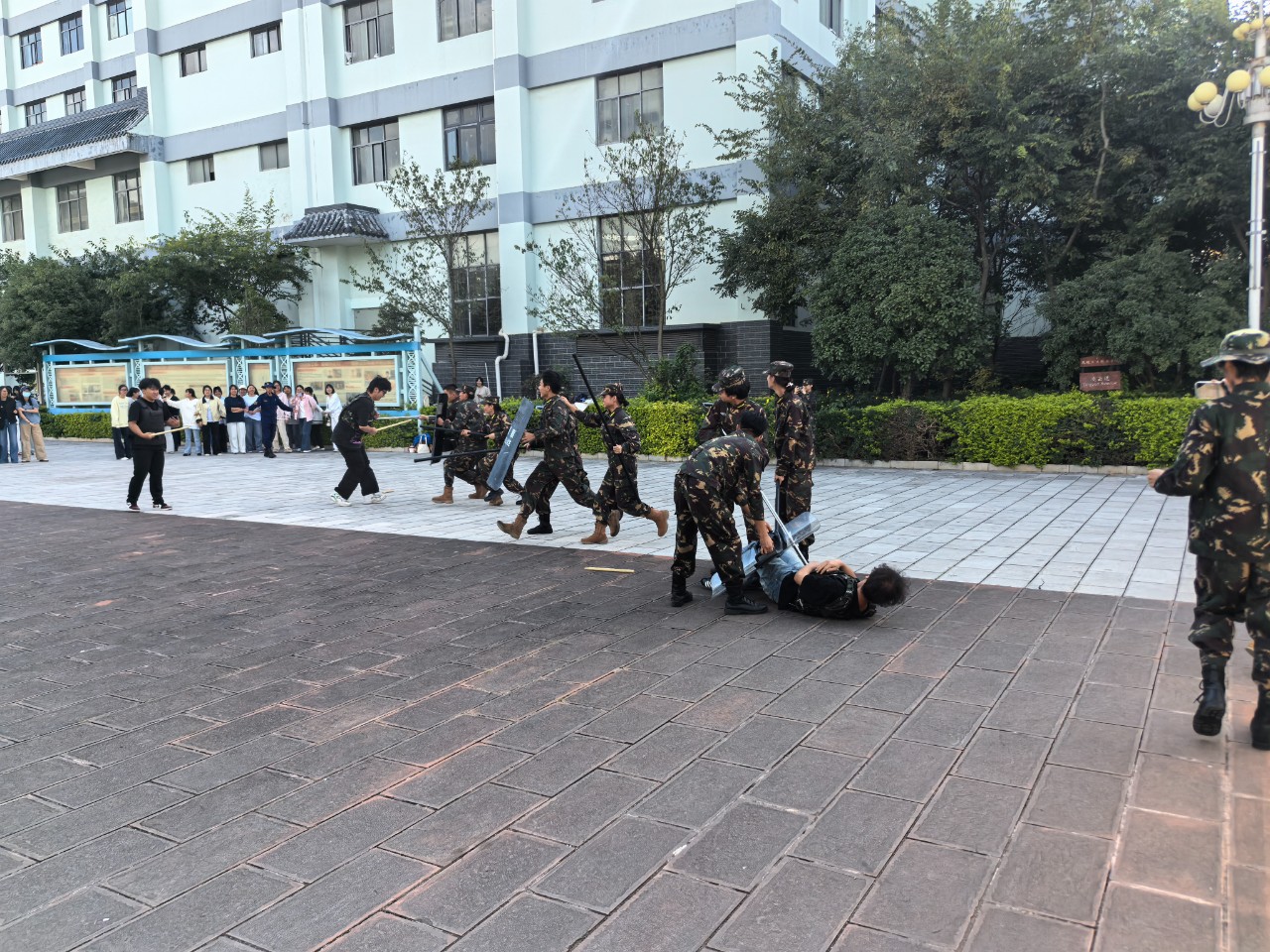 为深入贯彻落实总体国家安全观,推进《云南省学校安全条例》宣传教育,切实提升校园应急处突能力,2025年10月28日下午,威廉希尔williamhill举行秋季学期反恐防暴应急综合演练。本次演练在昆明市公安局晋宁分局、政保大队、昆阳派出所等单位指导下开展,学院后勤保卫处、保安队、学生应急处突部志愿者及部分师生共同参与,合力构筑校园安全“防护墙”。
