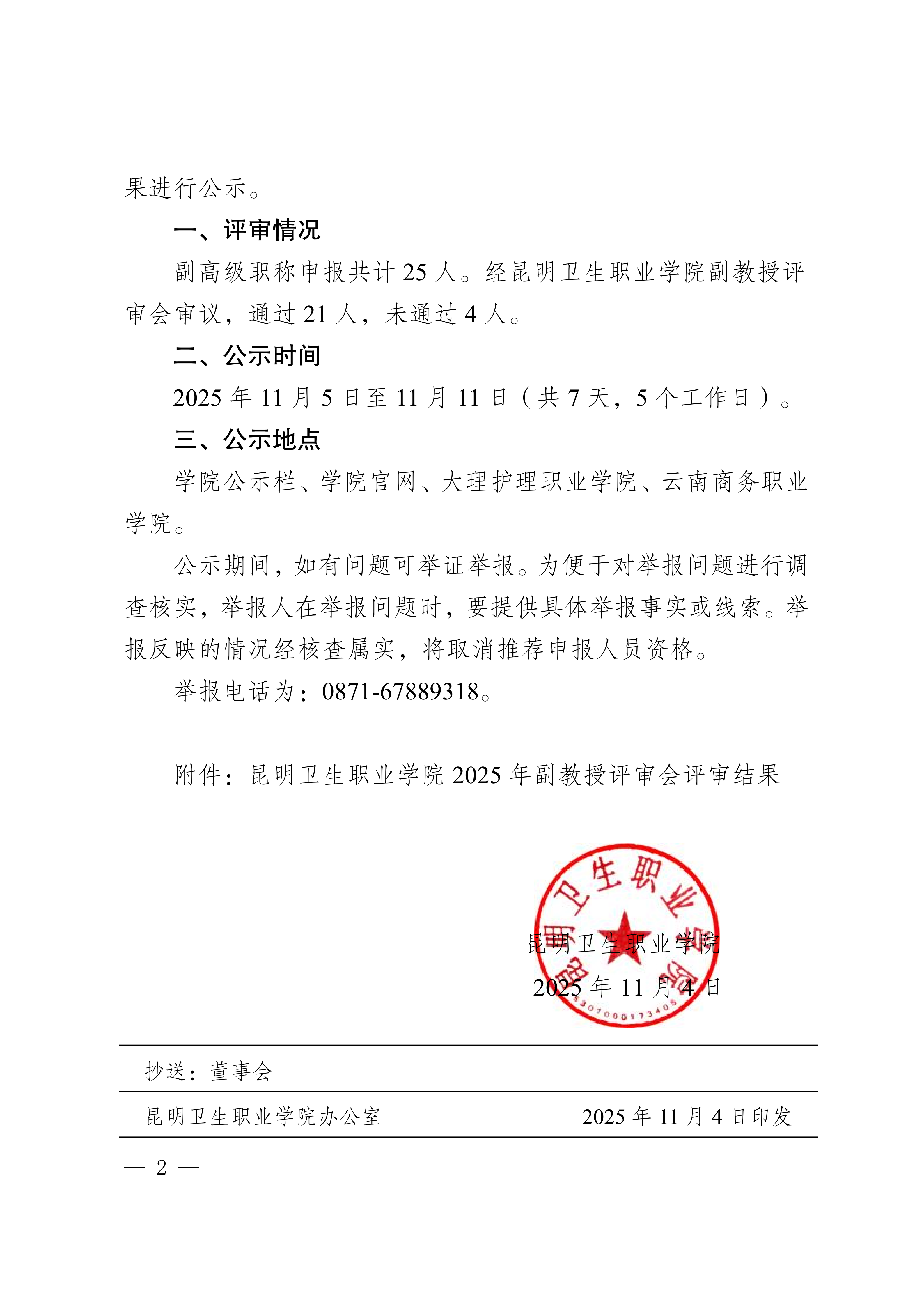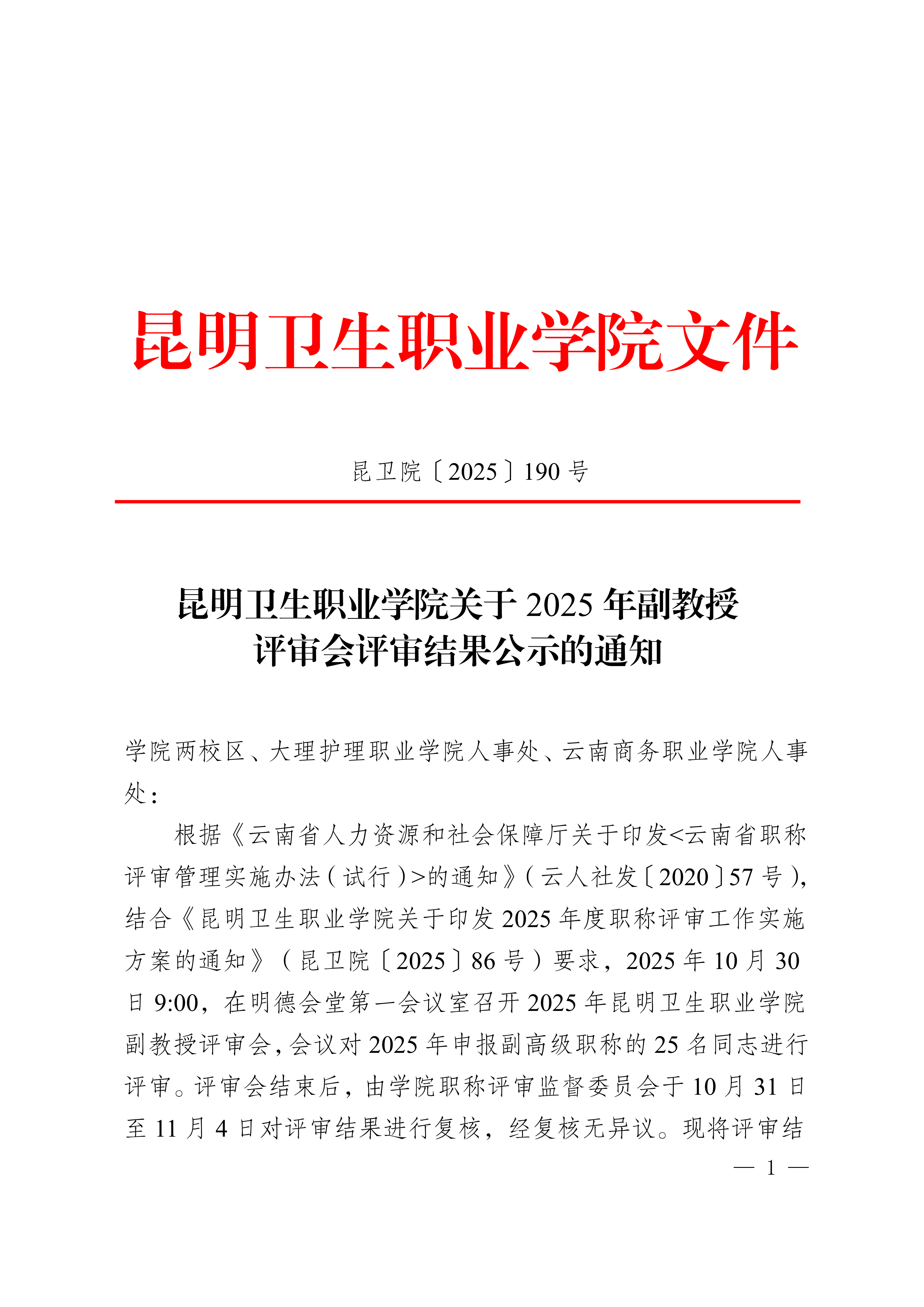 昆卫院〔2025〕190号 威廉希尔williamhill关于2025年副教授评审会评审结果公示的通知