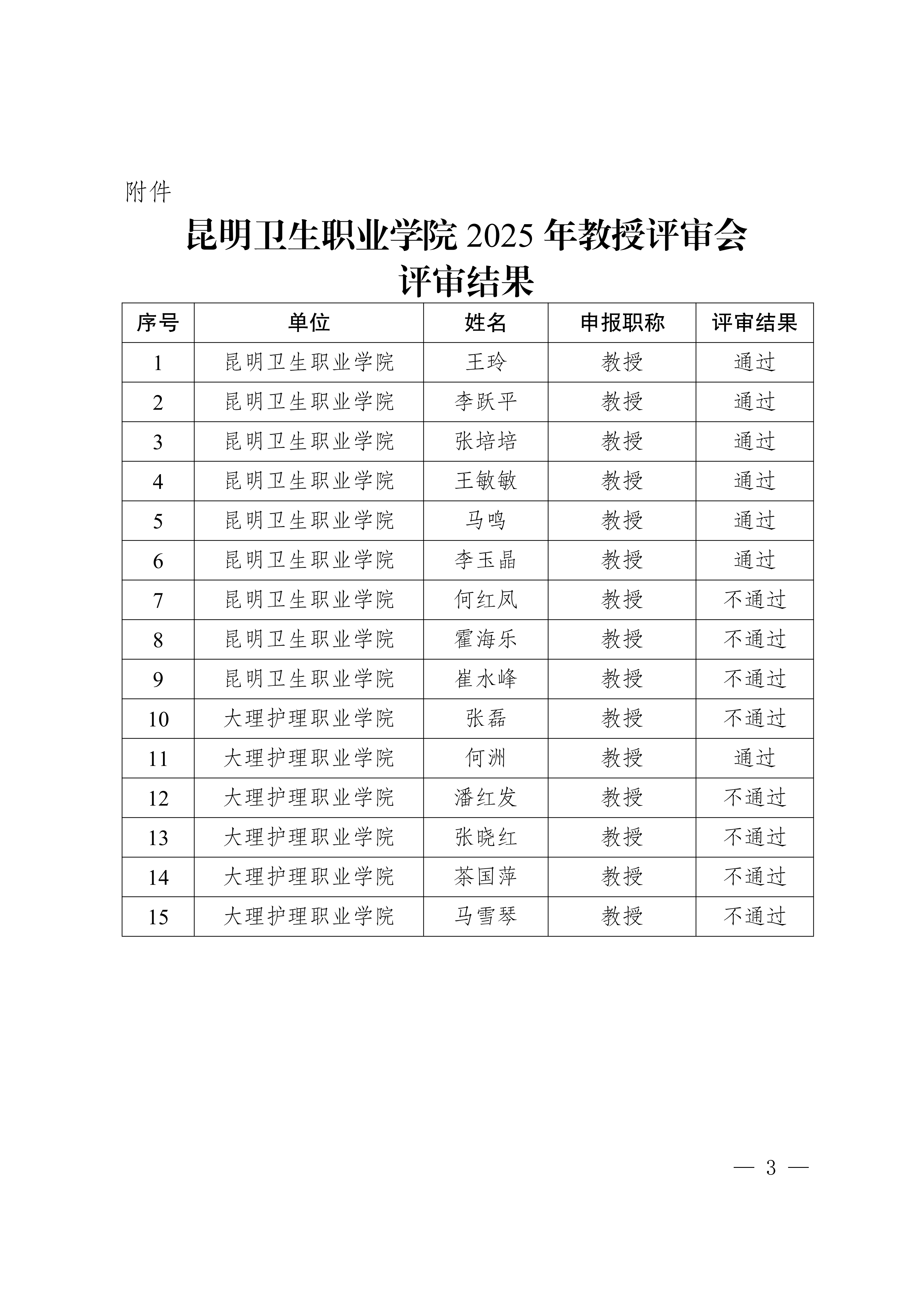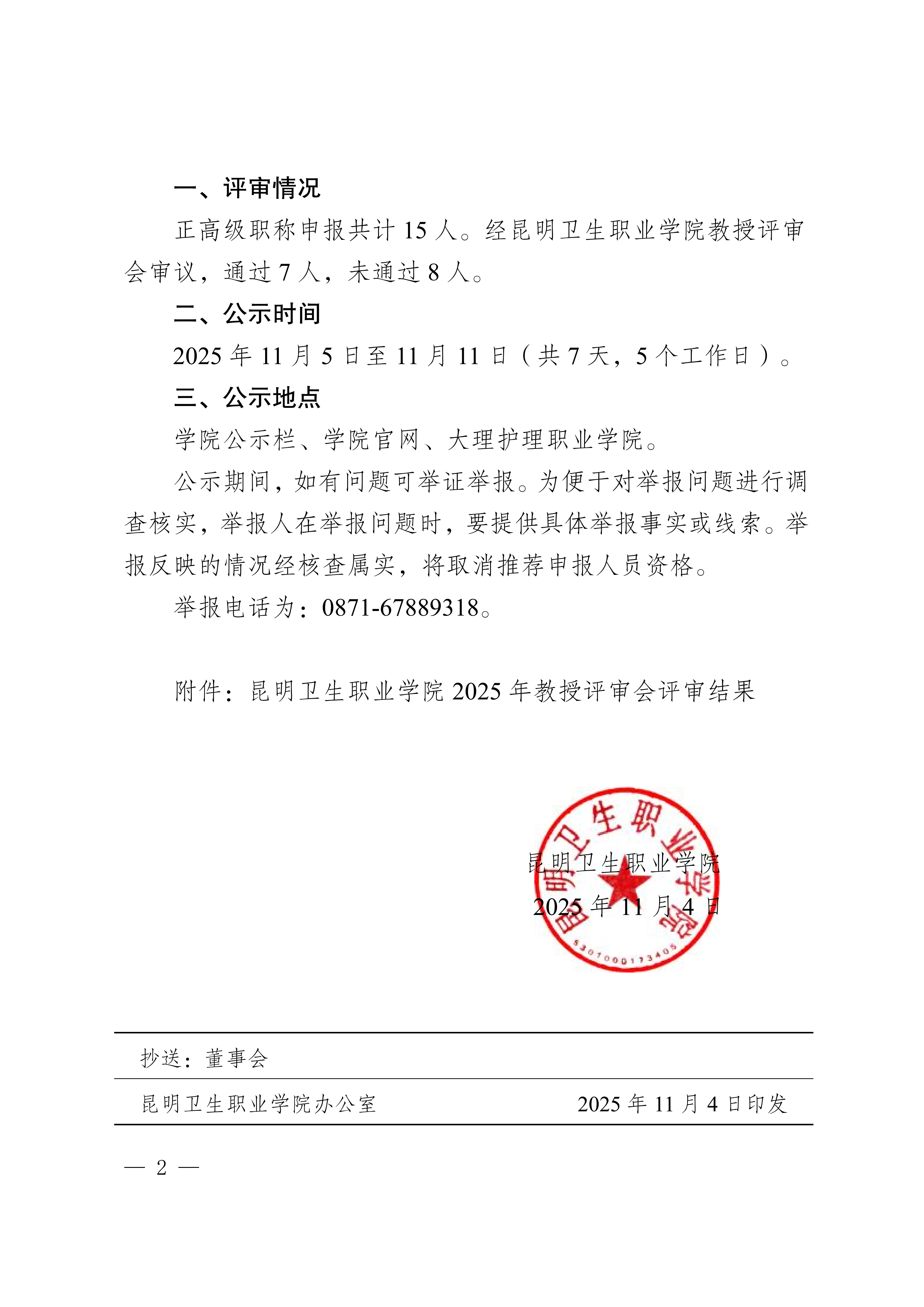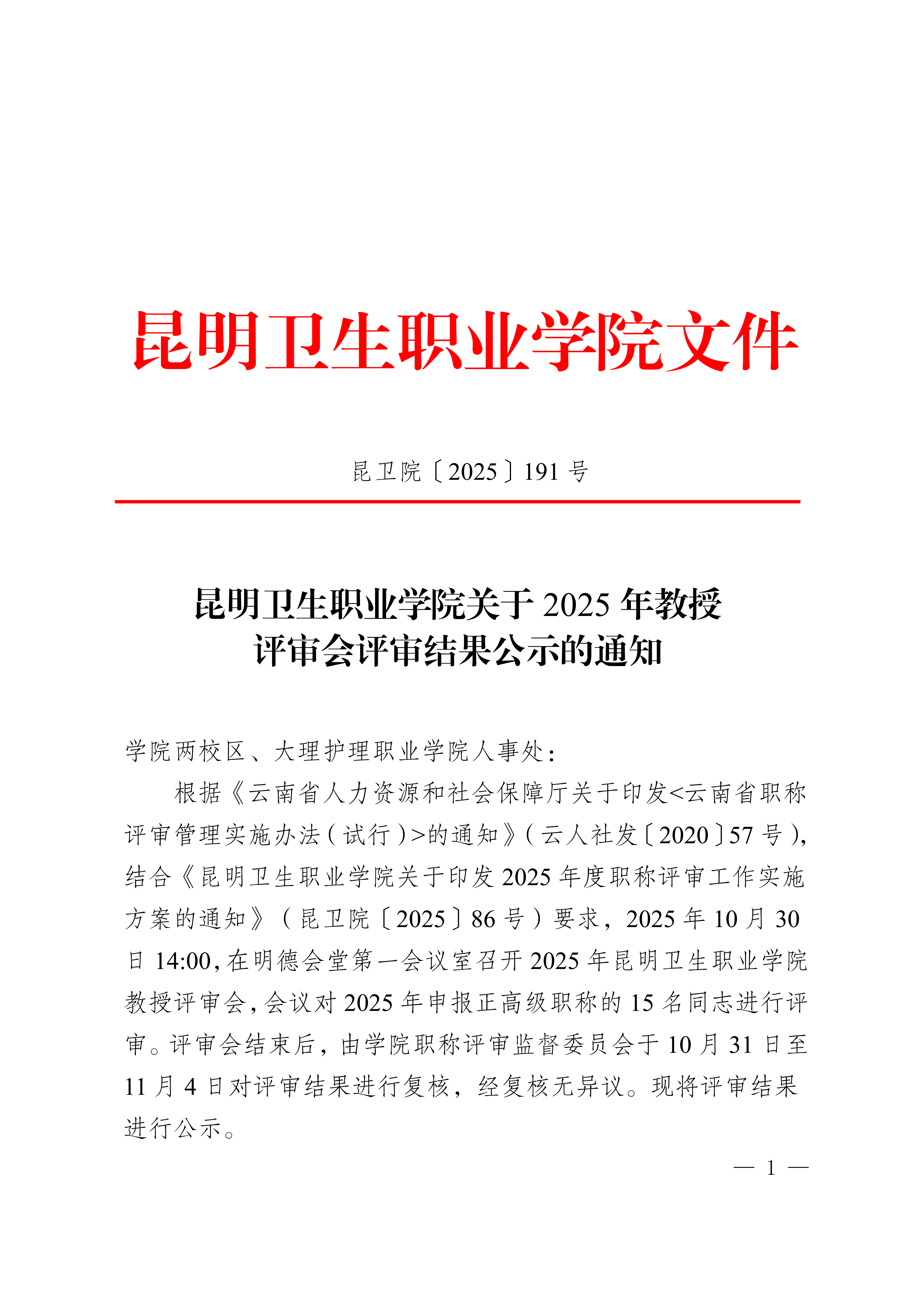 昆卫院〔2025〕191号 威廉希尔williamhill关于2025年教授评审会评审结果公示的通知