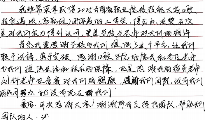 在此,衷心感谢云南省教育厅和大赛组委会为职业院校师生提供了这么好的交流学习平台;感谢日进公司对大赛的大力支持;感谢所有为本次比赛付出辛勤努力的工作人员和裁判员;感谢虎志辉、刘柯两位指导老师的精心指导和辛勤付出;感谢周莹莹、蒋玉枝、陈文卓三位同学的刻苦训练和出色表现。